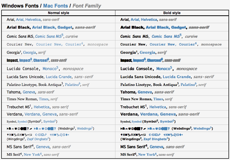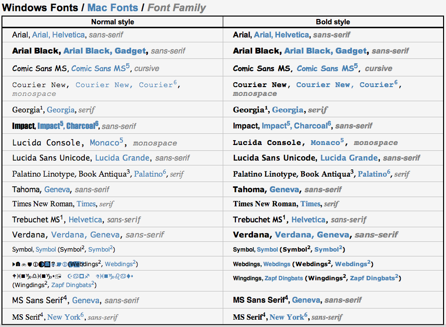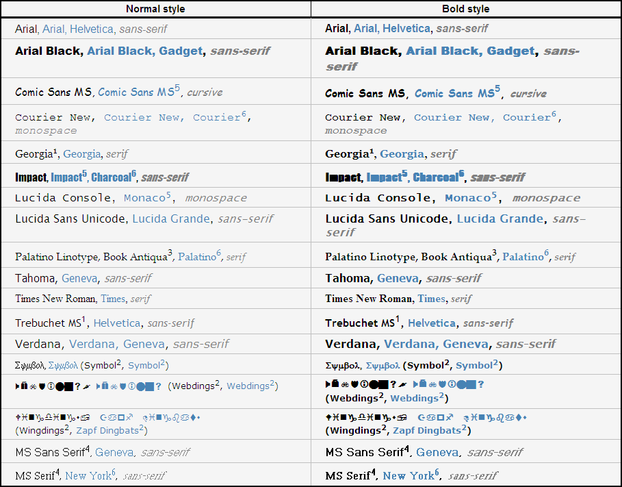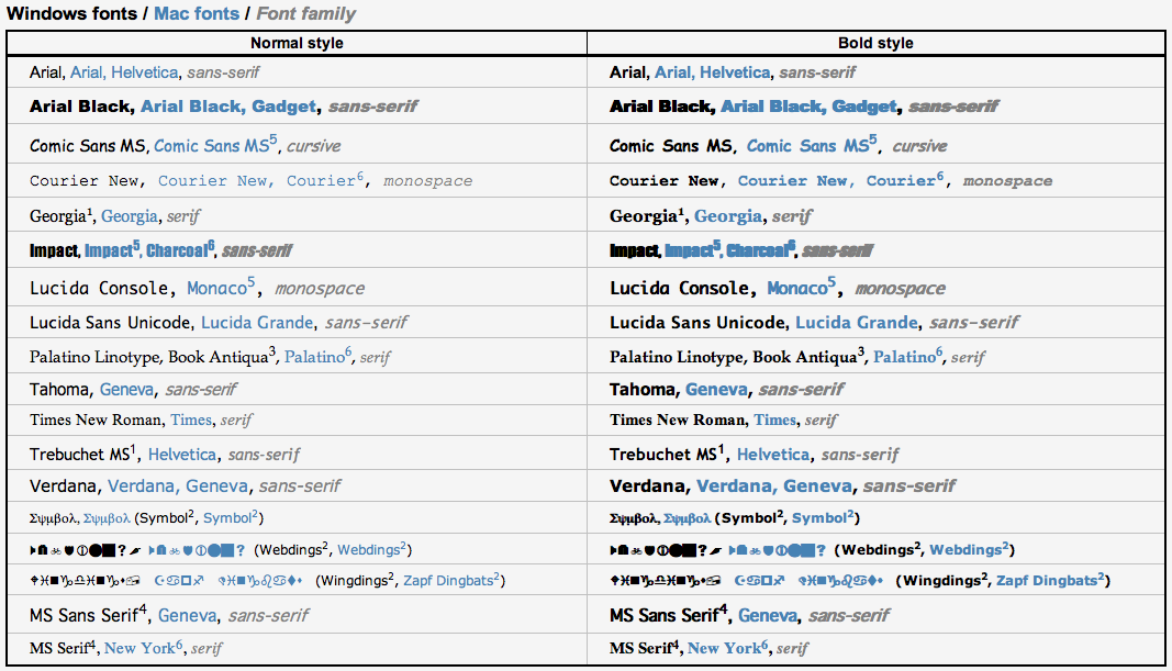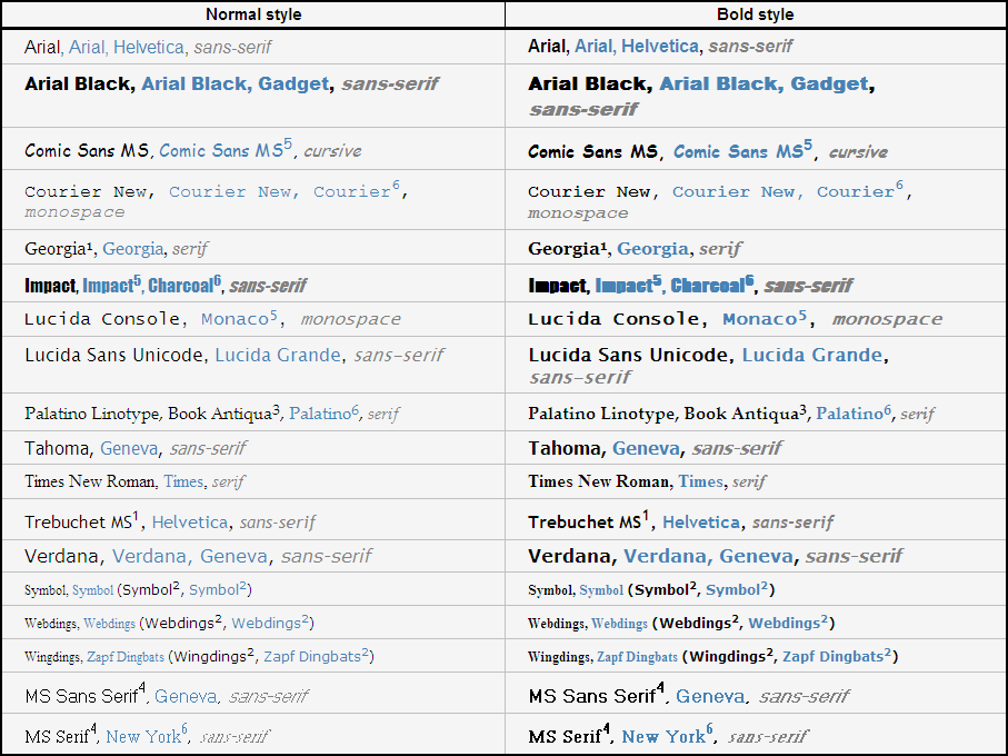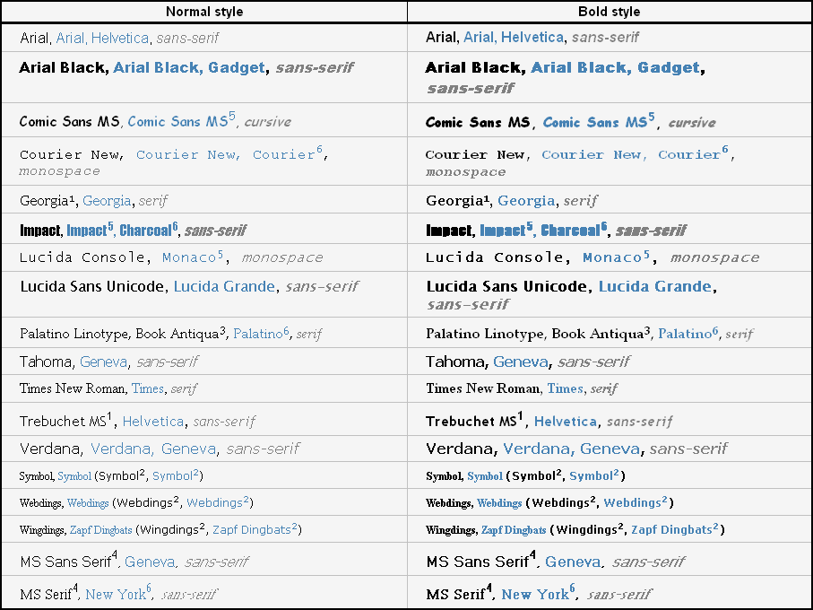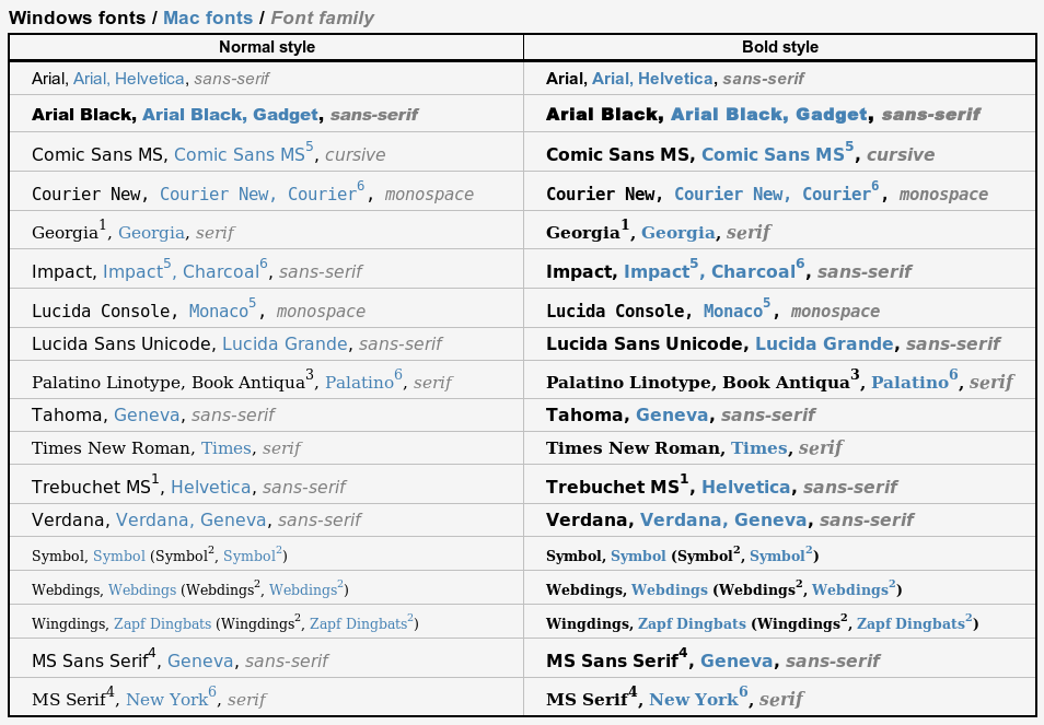 If you are new to web design, maybe you are thinking: "Why I have to limit to that small set of fonts? I have a large collection of nice fonts in my computer". Well, as seasoned web designers already know, browsers can use only the fonts installed in the same computer, so it means that every visitor of your web page needs to have all the fonts you want to use installed in his/her computer. Of course, different people will have different fonts installed, and thus come the need of a standard set of fonts. Fortunately, CSS allows set several values for the font-family property, which eases the task a bit.
